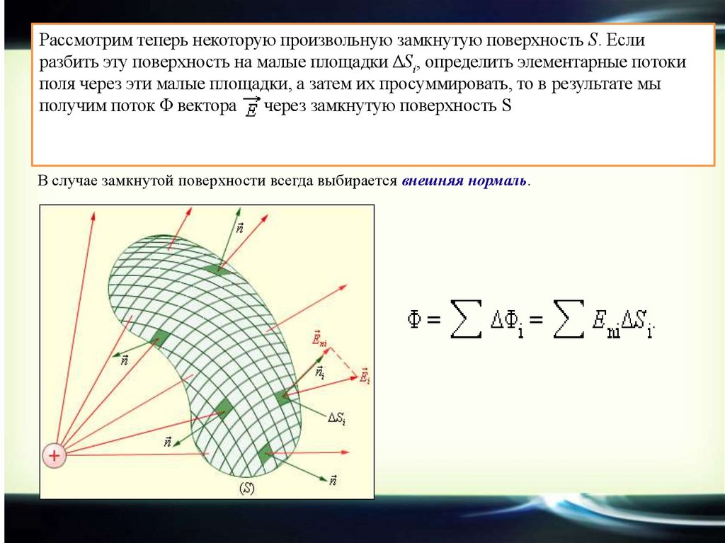 Рассмотрим теперь некоторую произвольную замкнутую поверхность S. Еслиразбить эту поверхность на малые площадки ΔSi, определить элементарные потоки