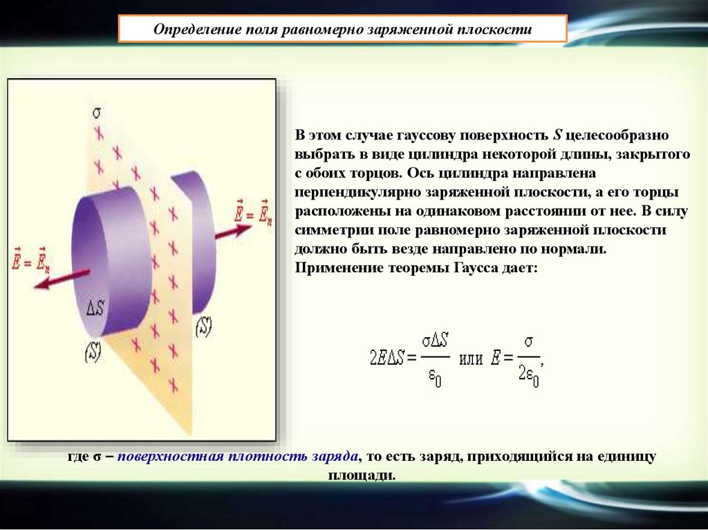 Определение поля равномерно заряженной плоскостиВ этом случае гауссову поверхность S целесообразно