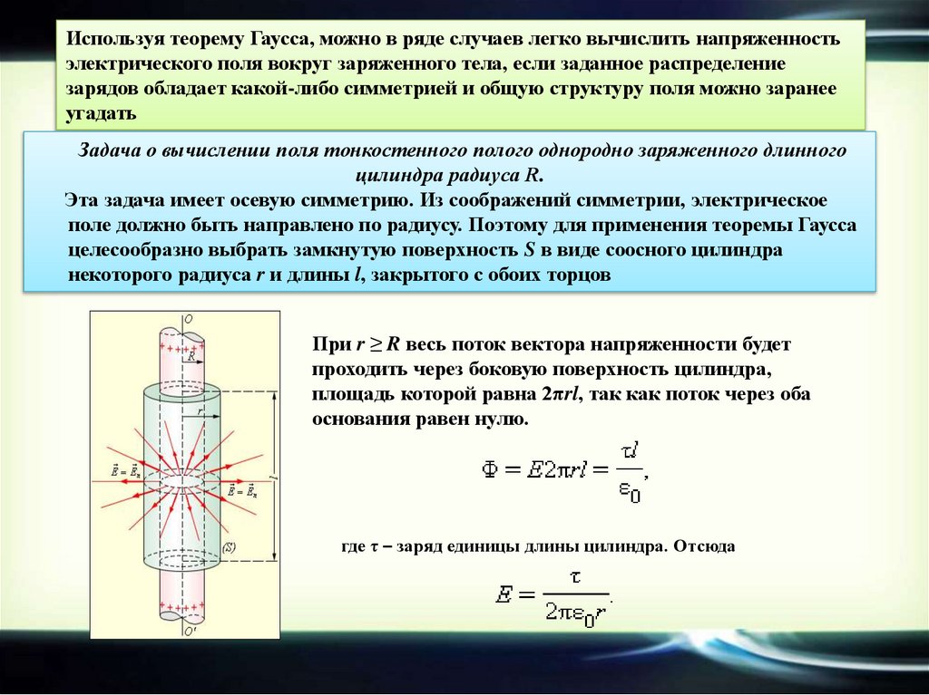 Используя теорему Гаусса, можно в ряде случаев легко вычислить напряженностьэлектрического поля вокруг заряженного тела, если заданное распределение