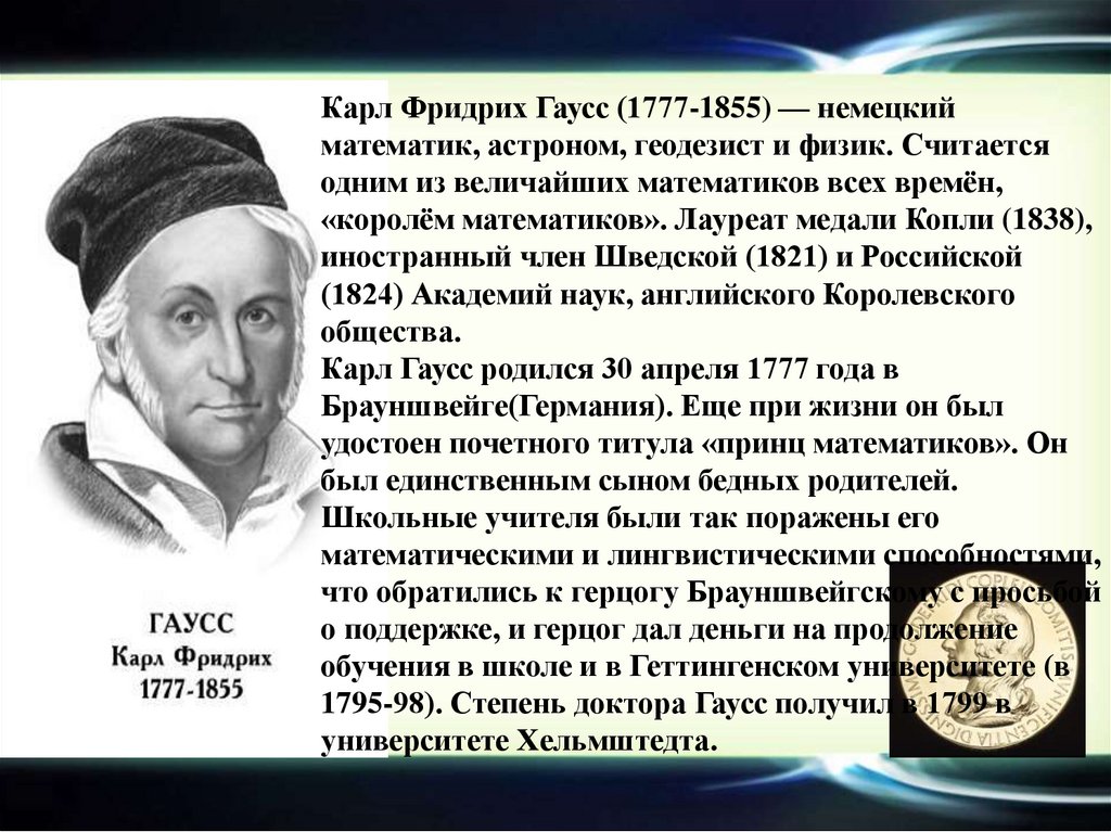 Карл Фридрих Гаусс (1777-1855) — немецкийматематик, астроном, геодезист и физик. Считается