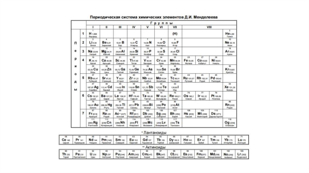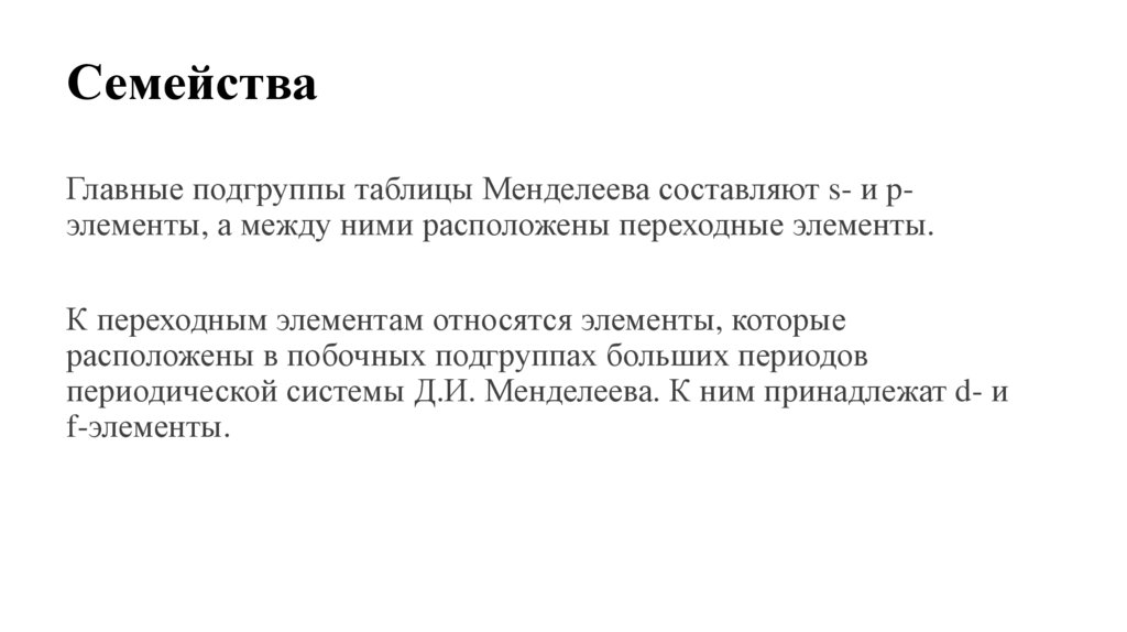 СемействаГлавные подгруппы таблицы Менделеева составляют s- и pэлементы, а между ними расположены переходные элементы.