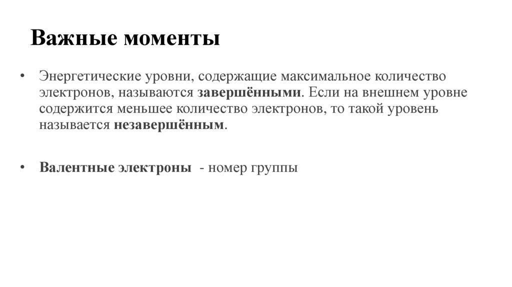 Важные моменты• Энергетические уровни, содержащие максимальное количество