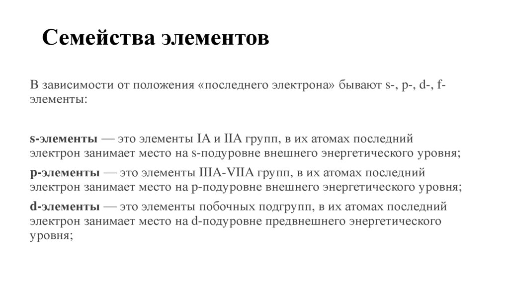 Семейства элементовВ зависимости от положения «последнего электрона» бывают s-, p-, d-, fэлементы: