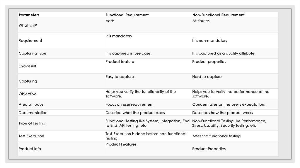 ◦ Describe functionality or system services (features).◦ Depend on the type of software, expected users and the type of system where the