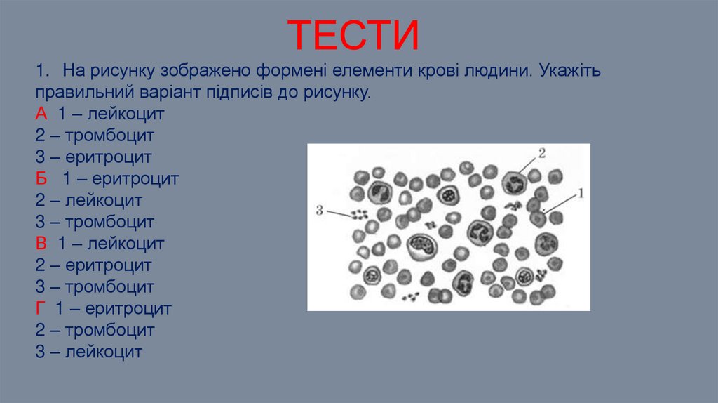 ТЕСТИ1. На рисунку зображено формені елементи крові людини. Укажіть