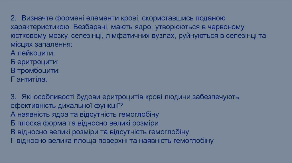 2. Визначте формені елементи крові, скориставшись поданоюхарактеристикою. Безбарвні, мають ядро, утворюються в червоному