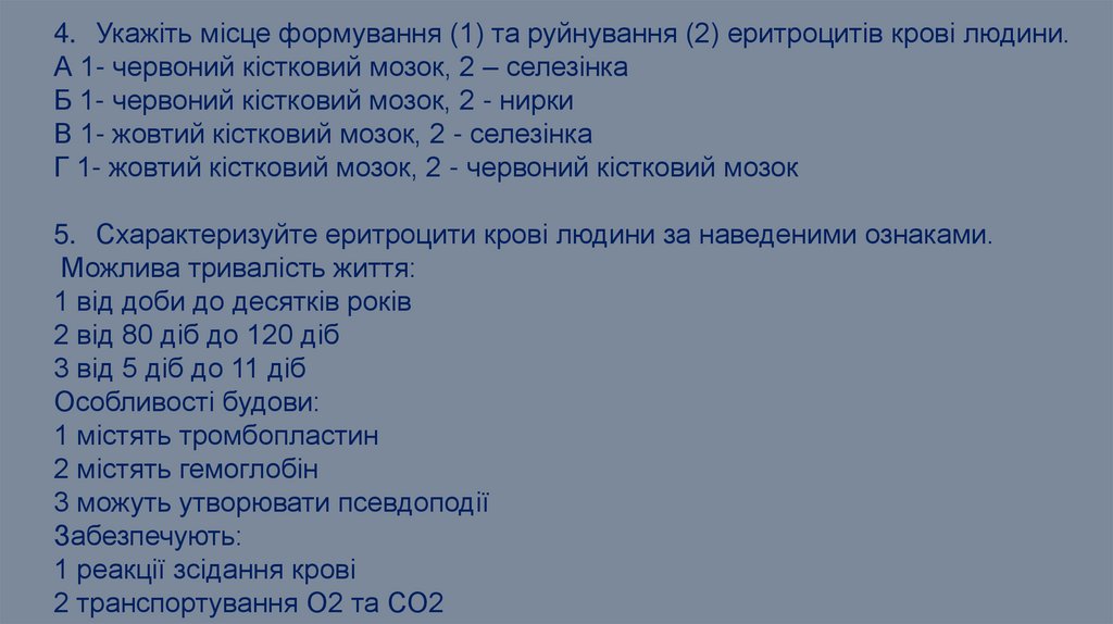 4. Укажіть місце формування (1) та руйнування (2) еритроцитів крові людини.А 1- червоний кістковий мозок, 2 – селезінка