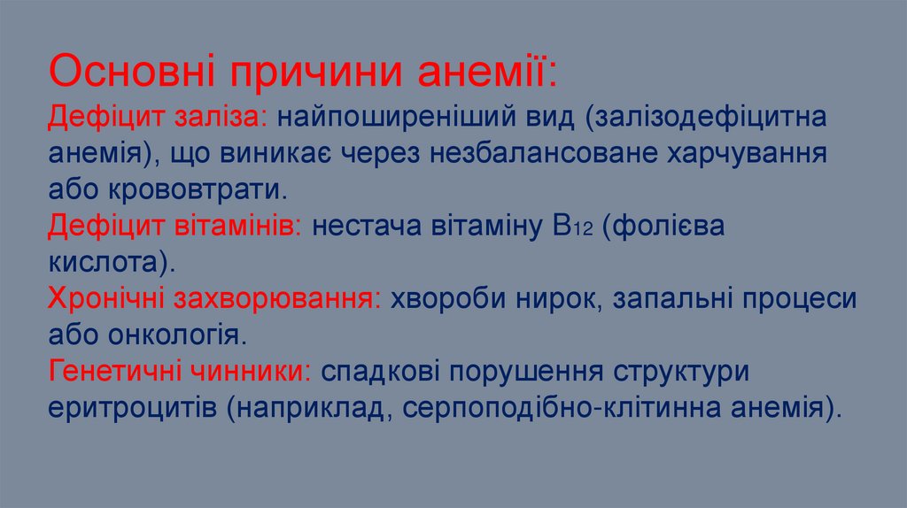 Основні причини анемії:Дефіцит заліза: найпоширеніший вид (залізодефіцитна