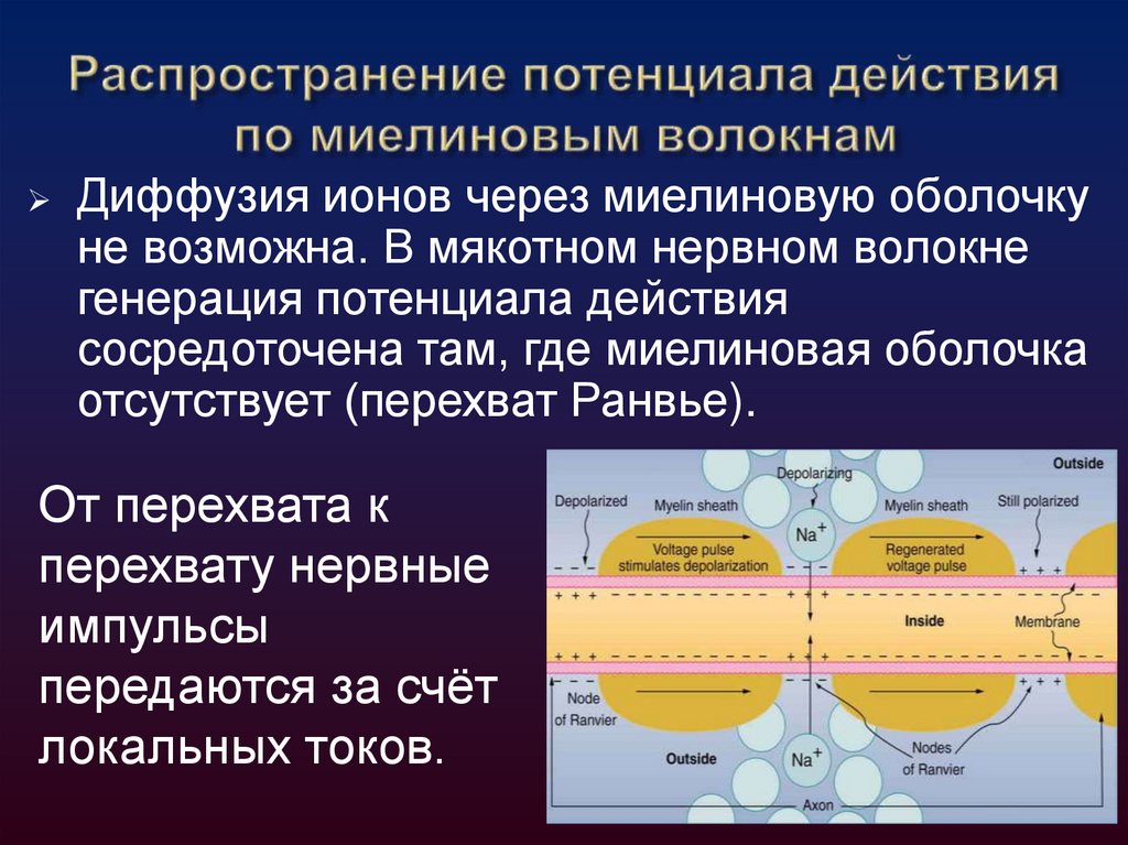 Диффузия ионов через миелиновую оболочкуне возможна. В мякотном нервном волокне
