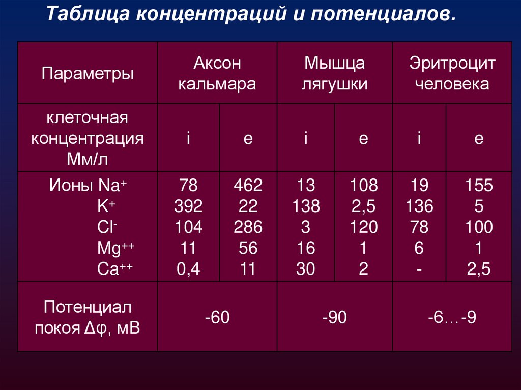 Таблица концентраций и потенциалов.Параметры