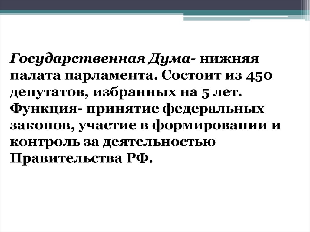 Государственная Дума- нижняяпалата парламента. Состоит из 450