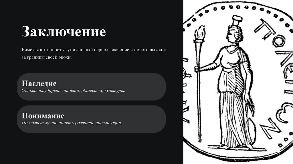 ЗаключениеРимская античность - уникальный период, значение которого выходит