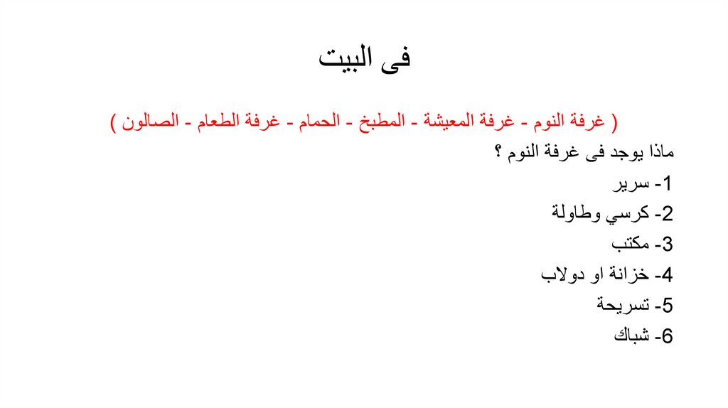فى البيت( غرفة النوم -غرفة المعيشة -المطبخ -الحمام -غرفة الطعام -الصالون )