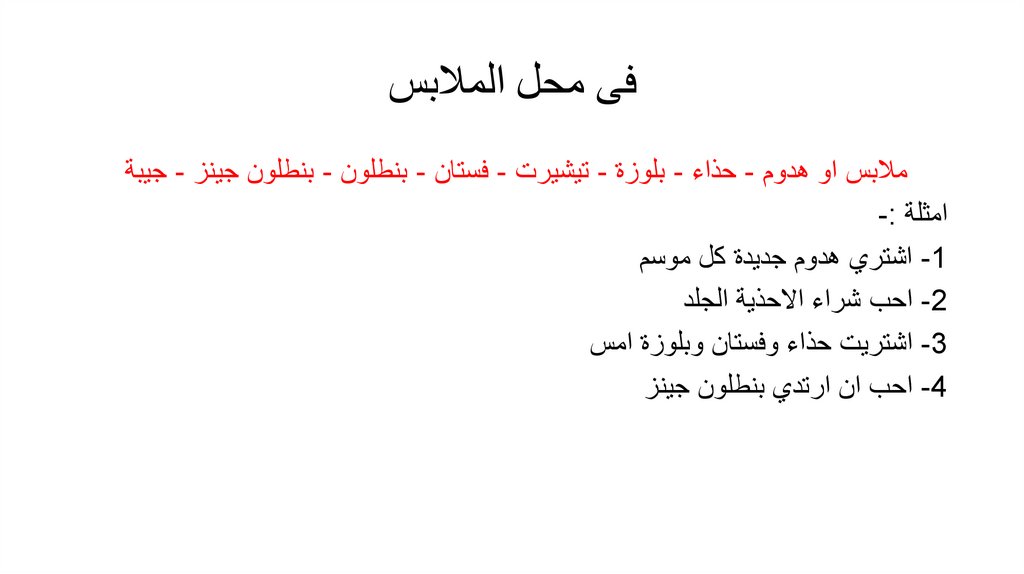 فى محل المالبسمالبس او هدوم -حذاء -بلوزة -تيشيرت -فستان -بنطلون -بنطلون جينز -جيبة