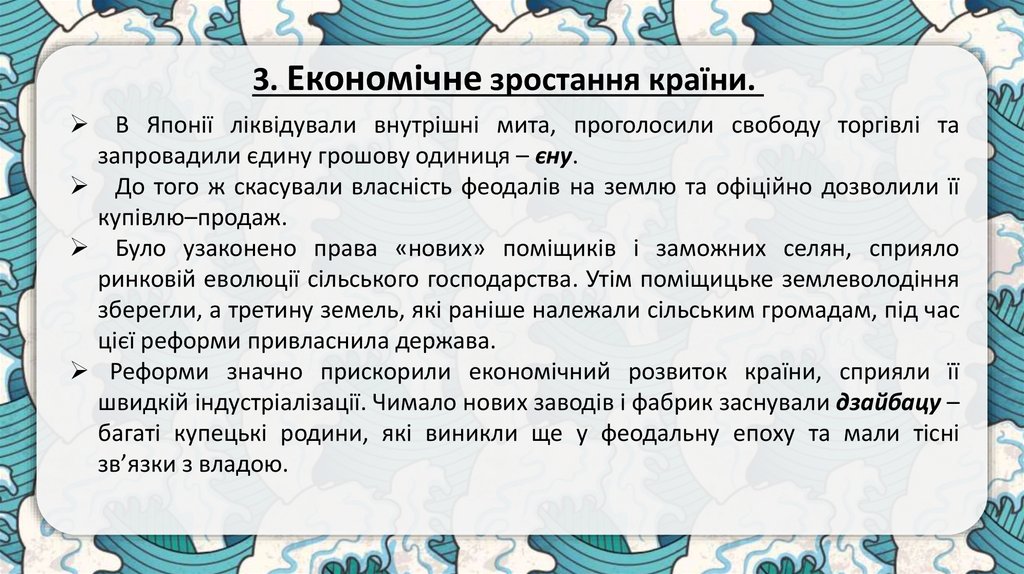 3. Економічне зростання країни.В Японії ліквідували внутрішні мита, проголосили свободу торгівлі та