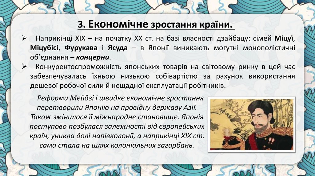 3. Економічне зростання країни.Наприкінці ХІХ – на початку ХХ ст. на базі власності дзайбацу: сімей Міцуї,