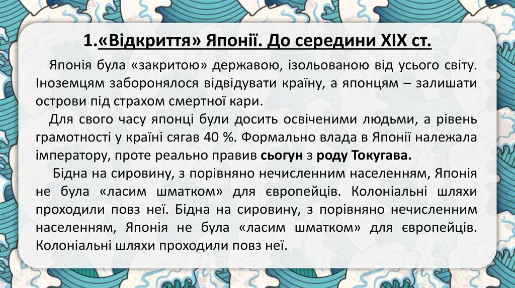 1.«Відкриття» Японії. До середини ХІХ ст.Японія була «закритою» державою, ізольованою від усього світу.