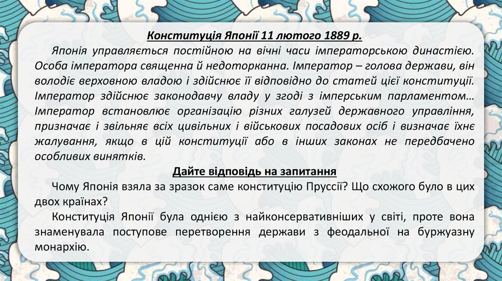 Конституція Японії 11 лютого 1889 р.Японія управляється постійною на вічні часи імператорською династією.