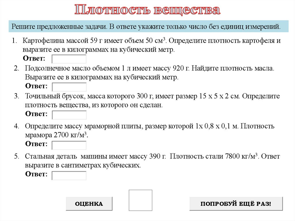 Решите предложенные задачи. В ответе укажите только число без единиц измерений.1. Картофелина массой 59 г имеет объем 50 см3. Определите плотность картофеля и
