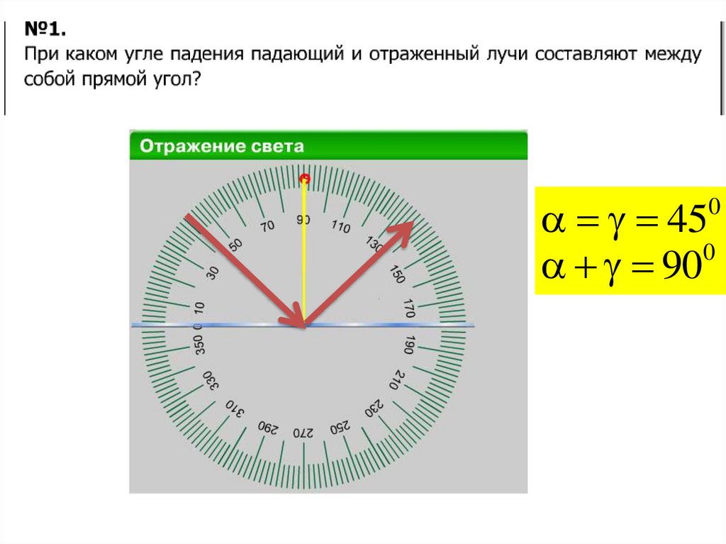 1. Угол падения луча на зеркало равен 45°.Начертите отраженный луч. На этом же чертеже