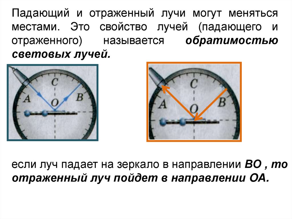 Падающий и отраженный лучи могут менятьсяместами. Это свойство лучей (падающего и