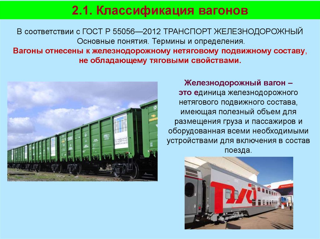 2.1. Классификация вагоновВ соответствии с ГОСТ Р 55056—2012 ТРАНСПОРТ ЖЕЛЕЗНОДОРОЖНЫЙ