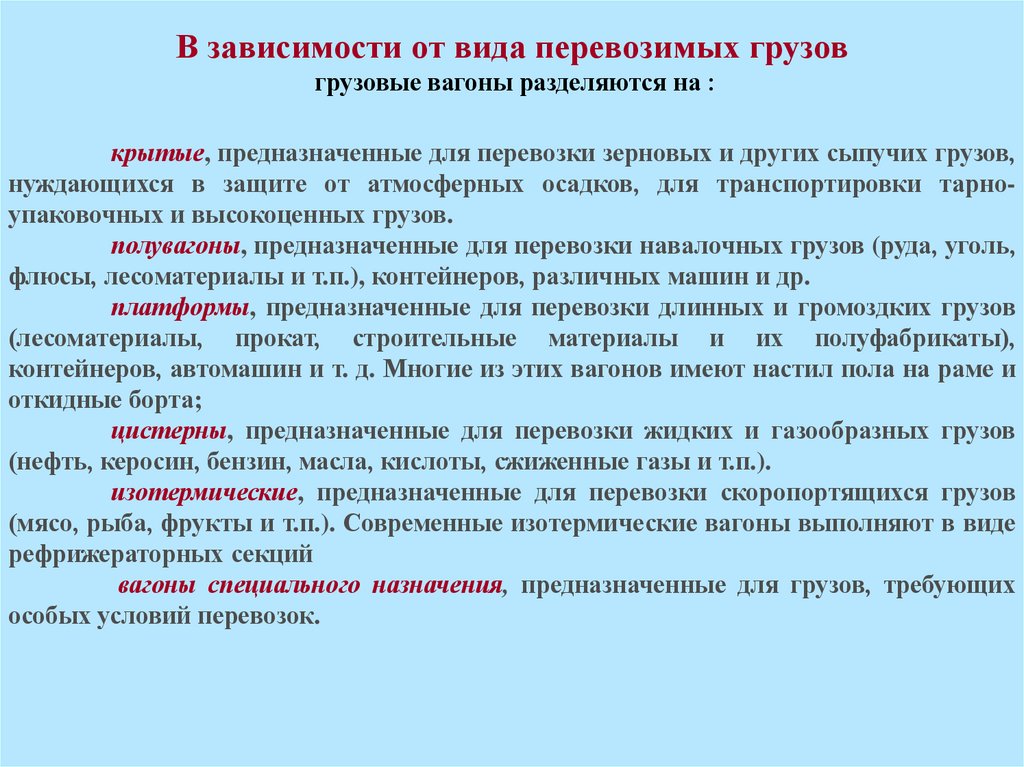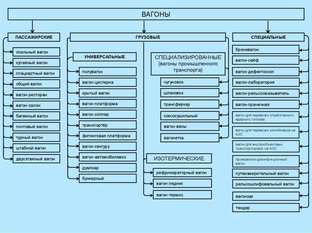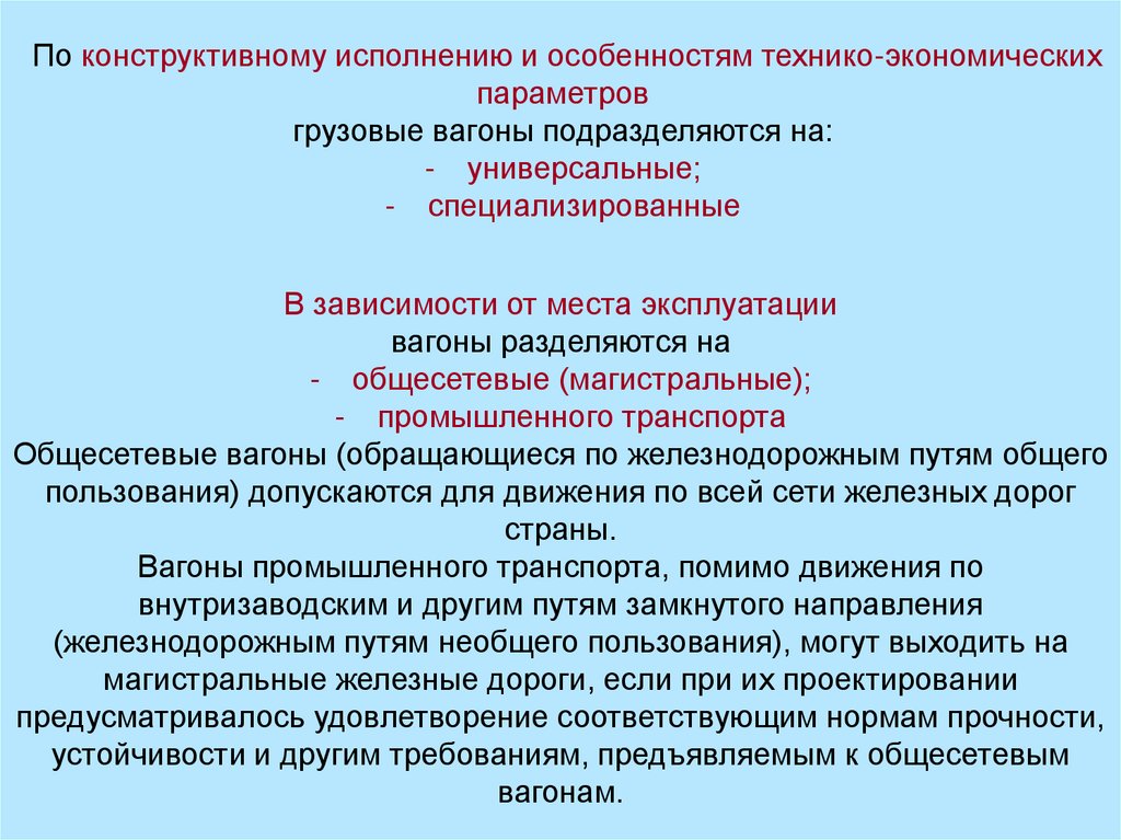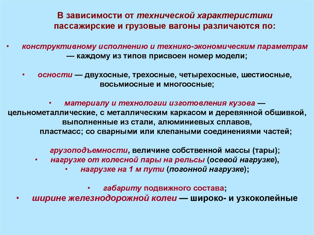 В зависимости от технической характеристикипассажирские и грузовые вагоны различаются по: