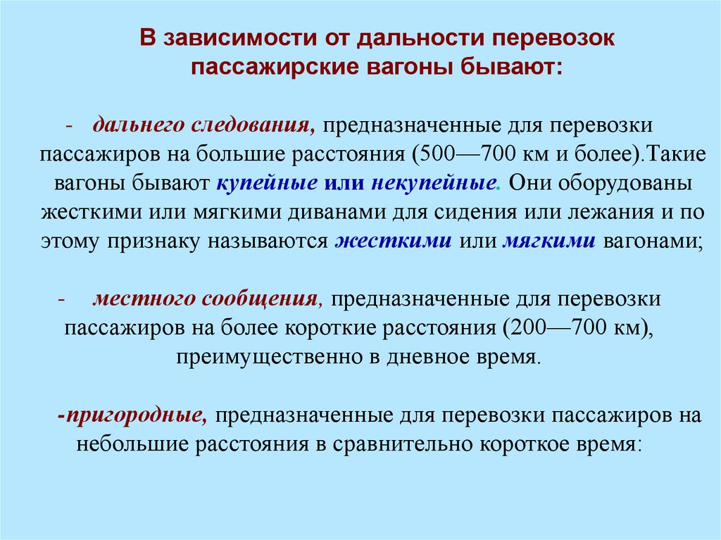 В зависимости от дальности перевозокпассажирские вагоны бывают:
