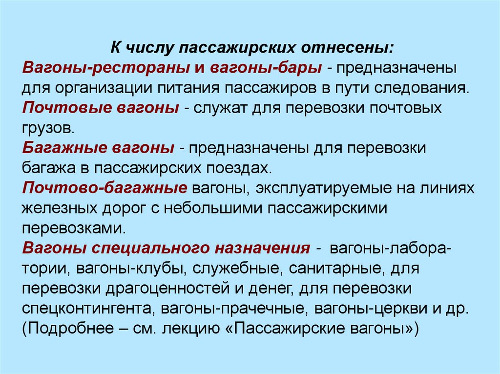 К числу пассажирских отнесены:Вагоны-рестораны и вагоны-бары - предназначены