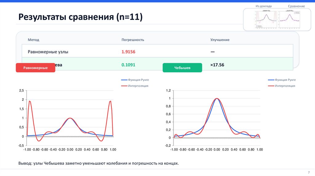 • Чебышев — оптимальные узлы: меньше колебаний и меньшая погрешность.