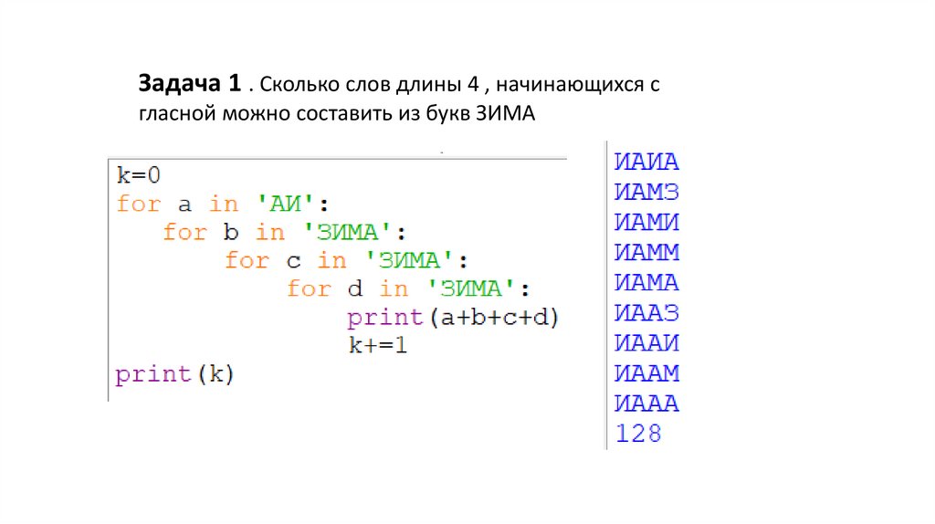Задача 1 . Сколько слов длины 4 , начинающихся сгласной можно составить из букв ЗИМА