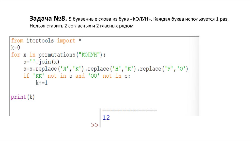 Задача №8. 5 буквенные слова из букв «КОЛУН». Каждая буква используется 1 раз.Нельзя ставить 2 согласных и 2 гласных рядом