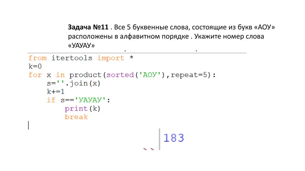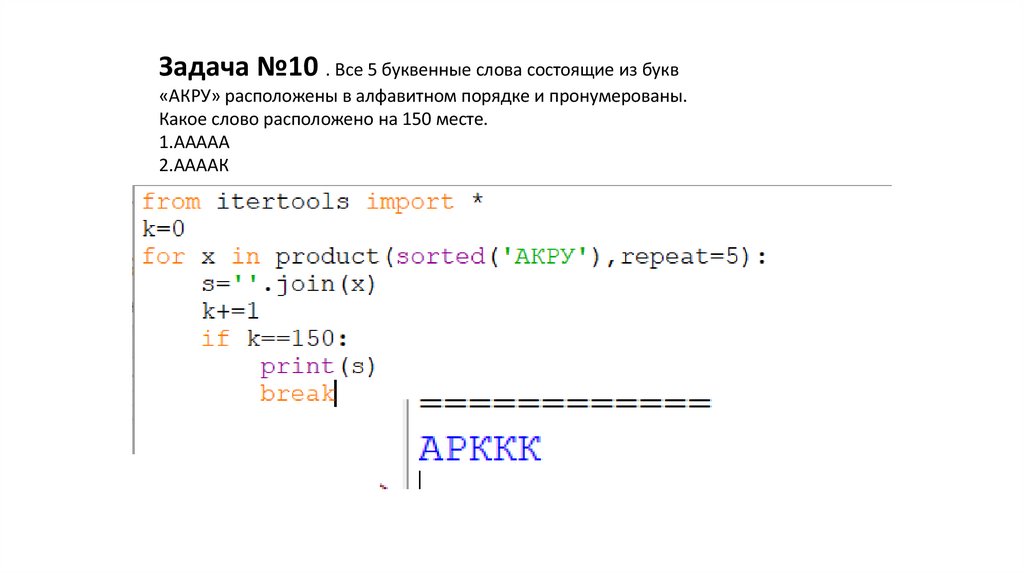Задача №10 . Все 5 буквенные слова состоящие из букв«АКРУ» расположены в алфавитном порядке и пронумерованы.
