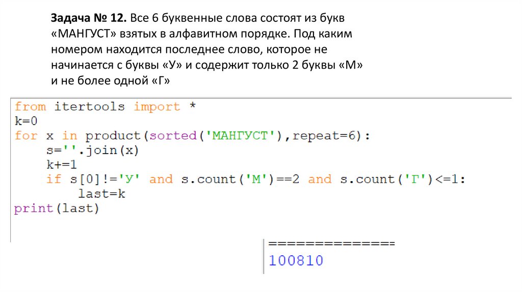 Задача № 12. Все 6 буквенные слова состоят из букв«МАНГУСТ» взятых в алфавитном порядке. Под каким