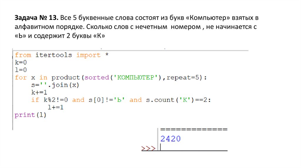 Задача № 13. Все 5 буквенные слова состоят из букв «Компьютер» взятых валфавитном порядке. Сколько слов с нечетным номером , не начинается с