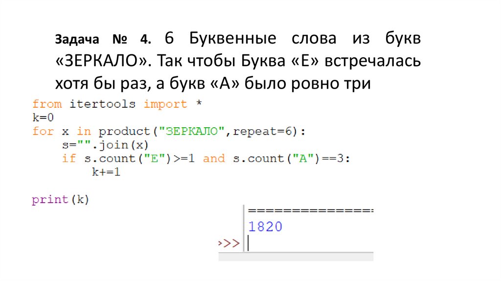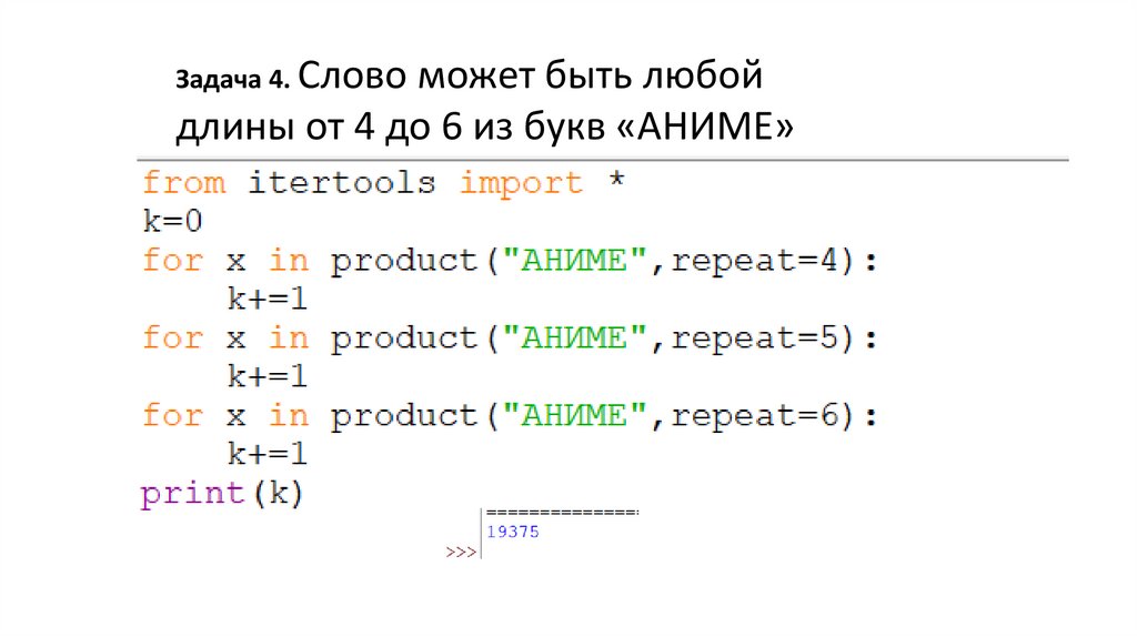 Задача 4. Слово может быть любойдлины от 4 до 6 из букв «АНИМЕ»