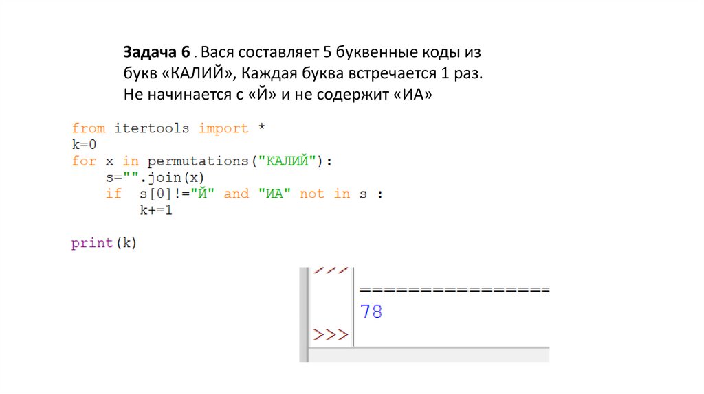 Задача 6 . Вася составляет 5 буквенные коды избукв «КАЛИЙ», Каждая буква встречается 1 раз.