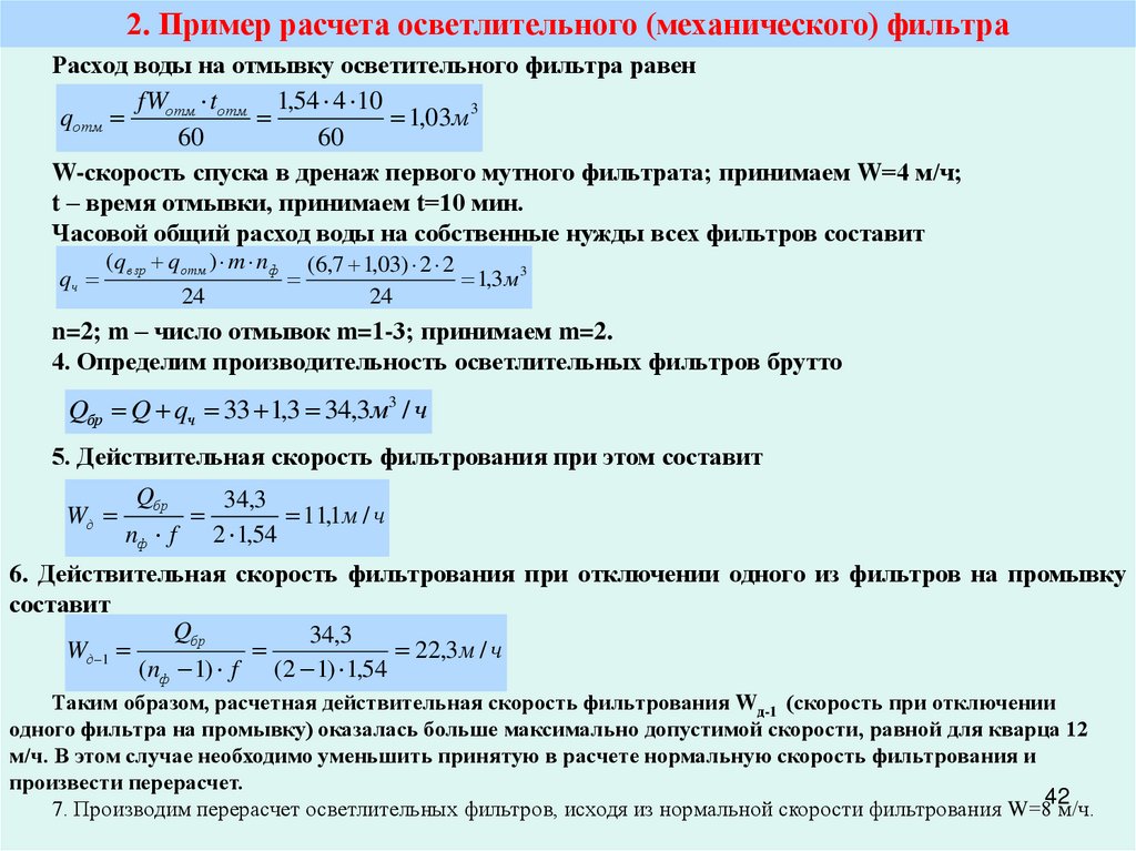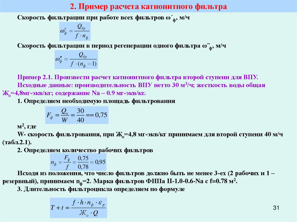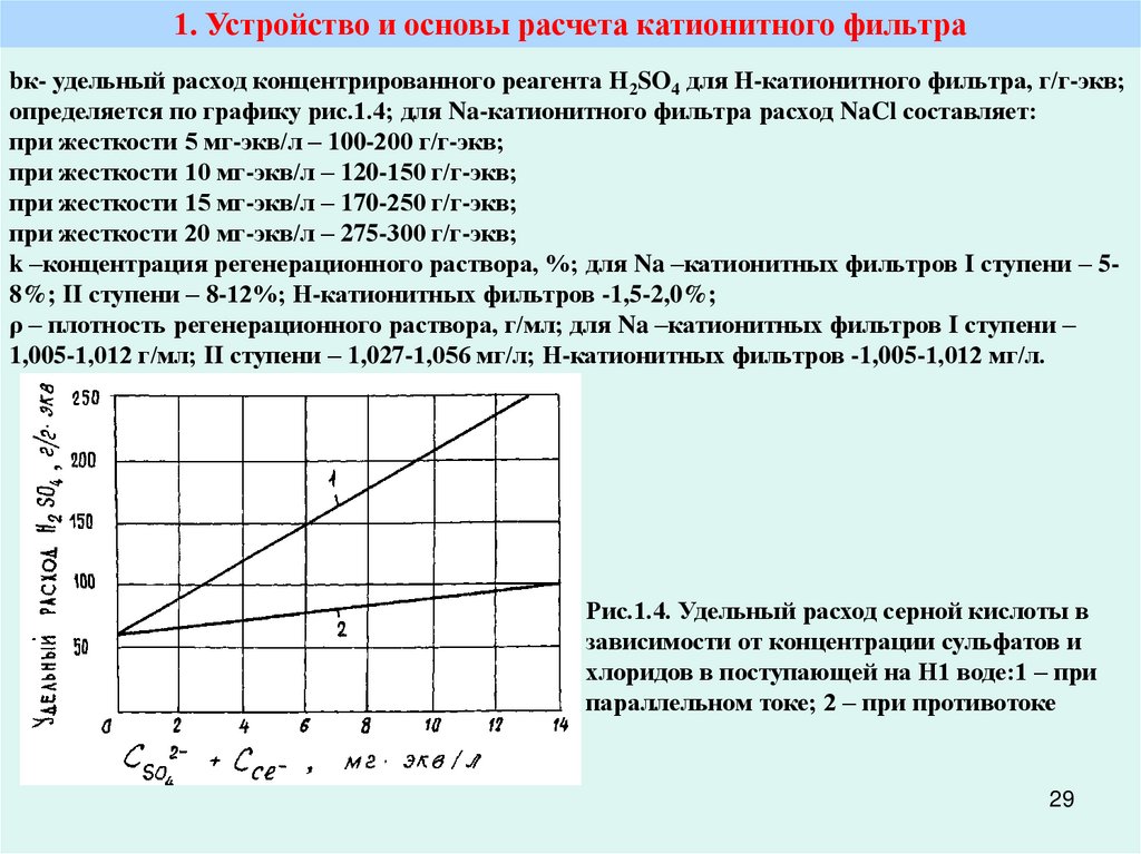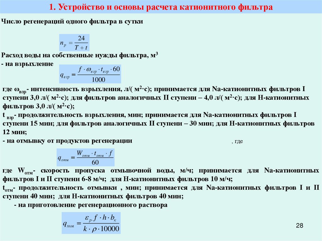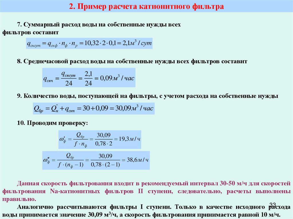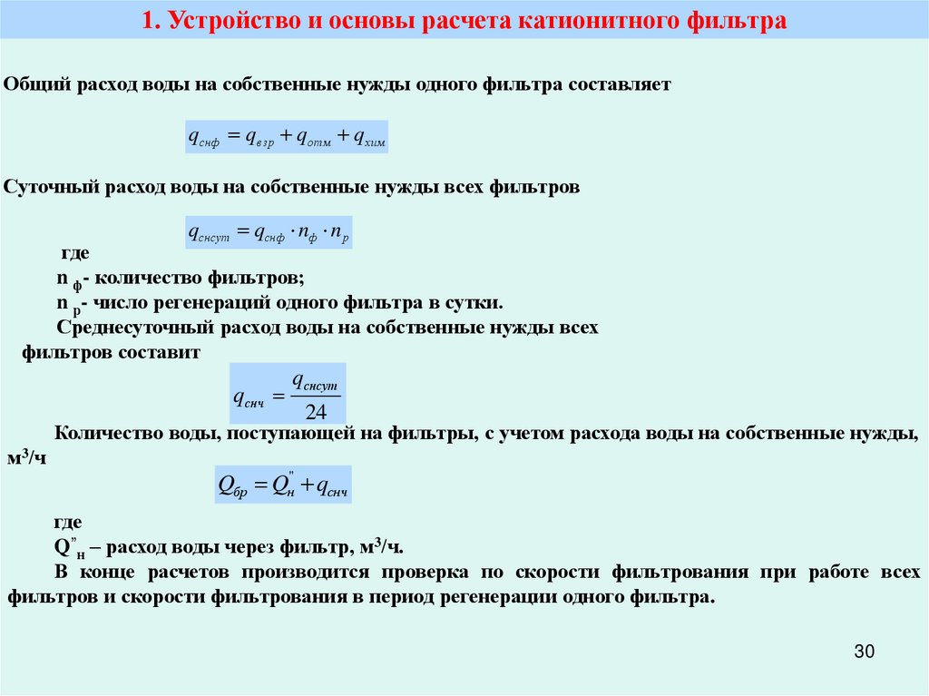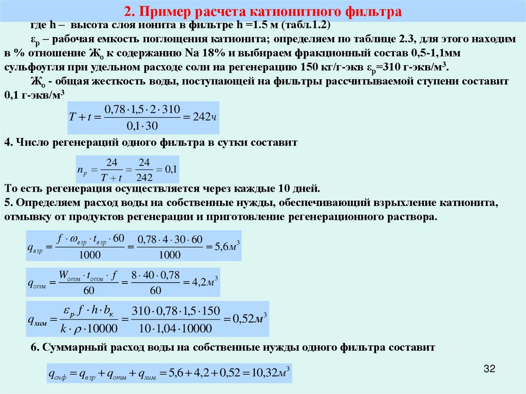 Расчеты начинают с определения расхода 100 % серной кислоты на 1 регенерацию Нкатионитного фильтра. Затем, зная количество регенераций одного фильтра определяют