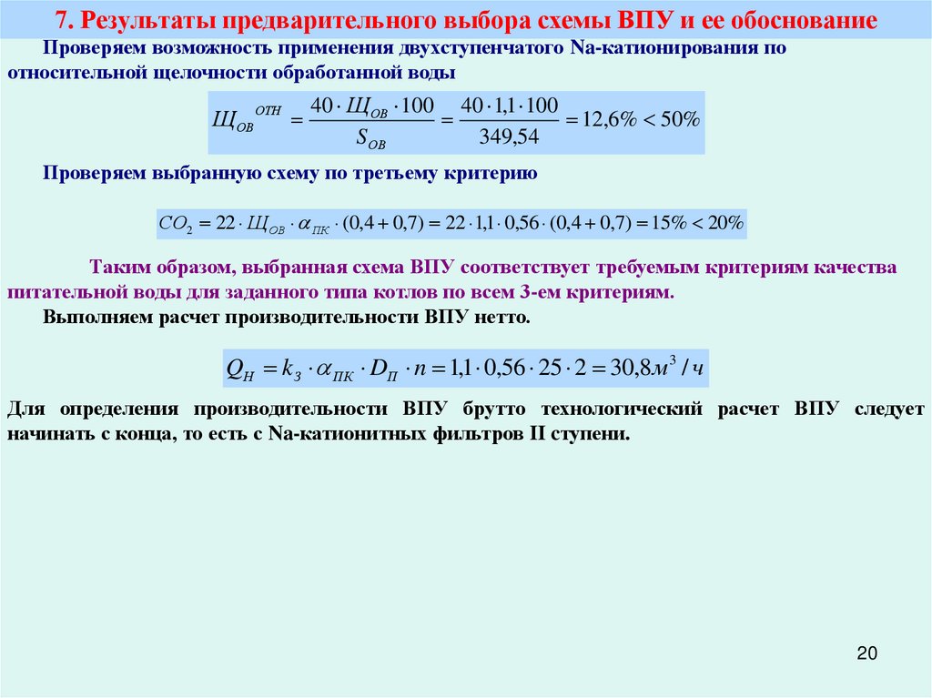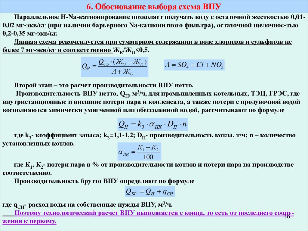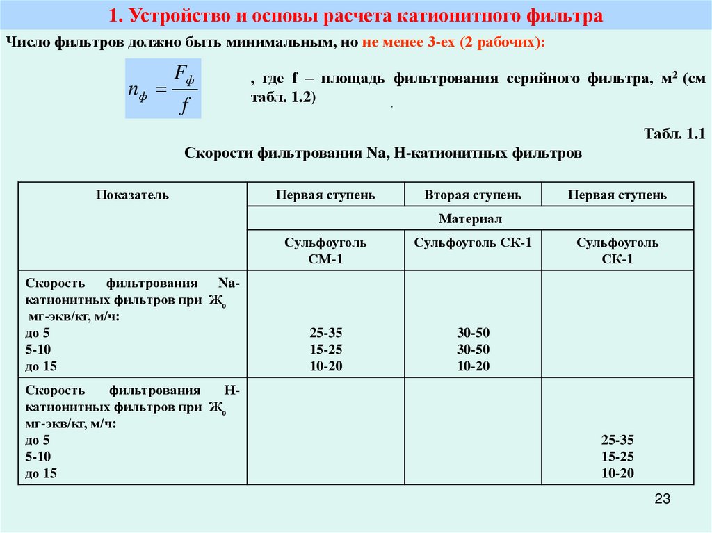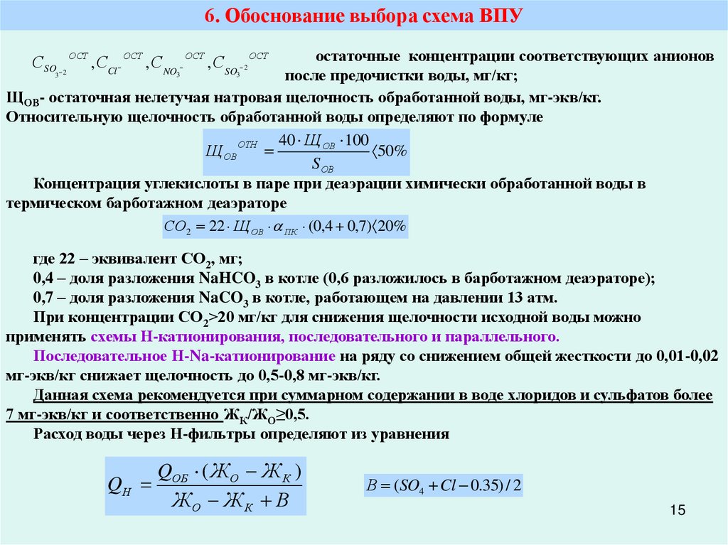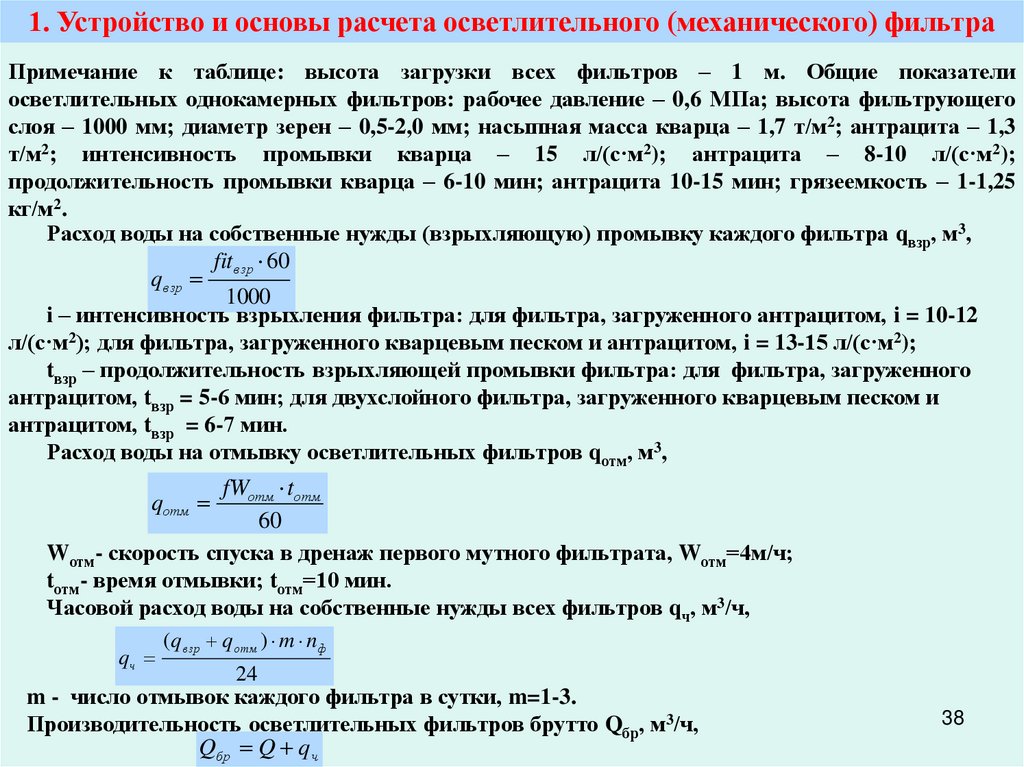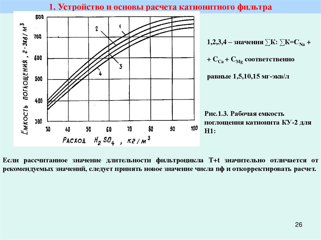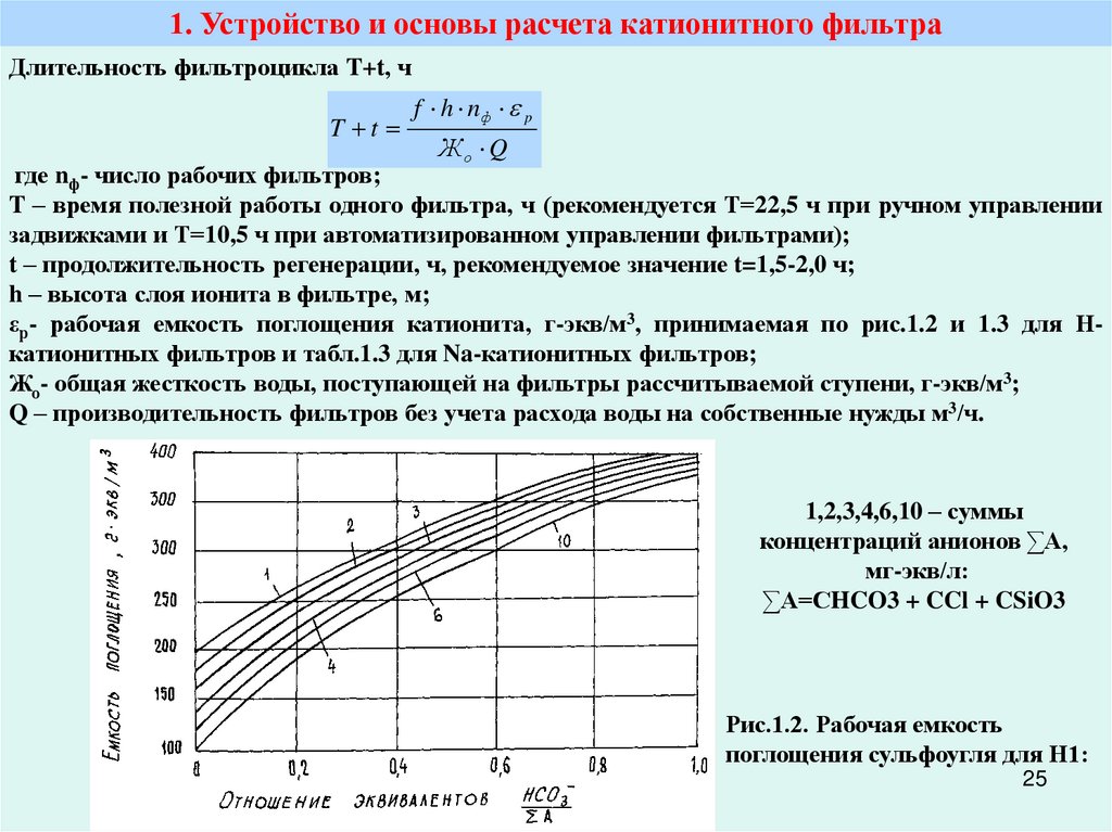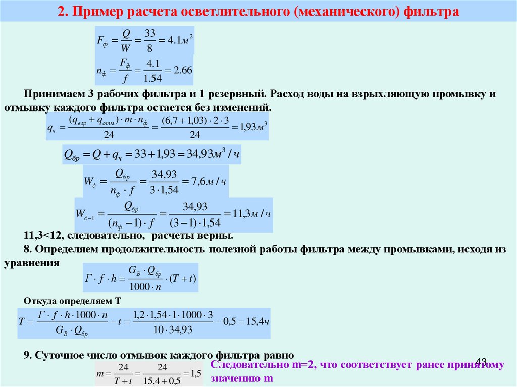 Расчеты начинают с определения расхода 100 % серной кислоты на 1 регенерацию Нкатионитного фильтра. Затем, зная количество регенераций одного фильтра определяют