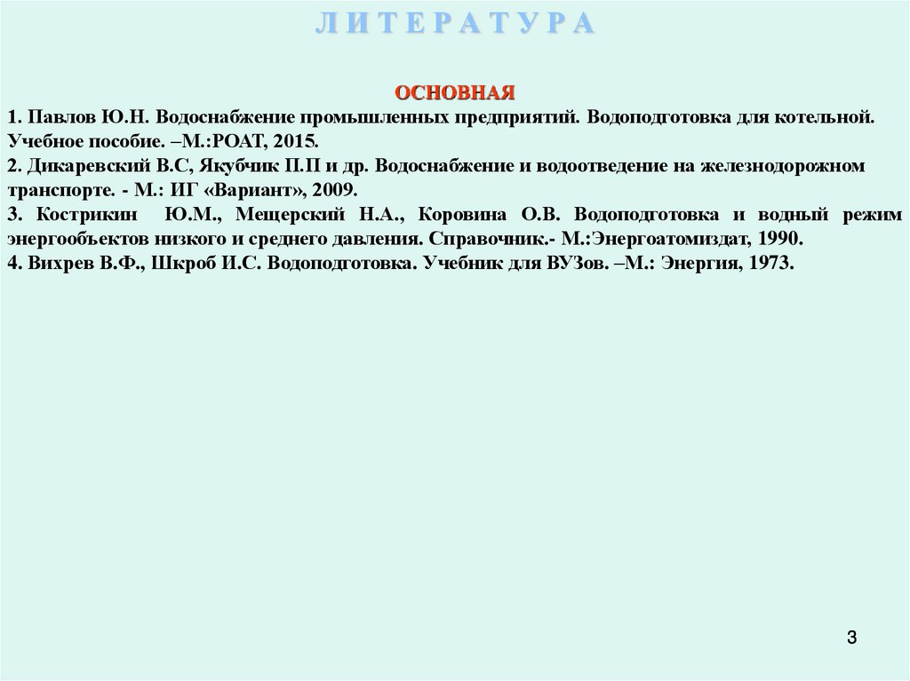 4. Вихрев В.Ф., Шкроб И.С. Водоподготовка. Учебник для ВУЗов. –М.: Энергия, 1973.