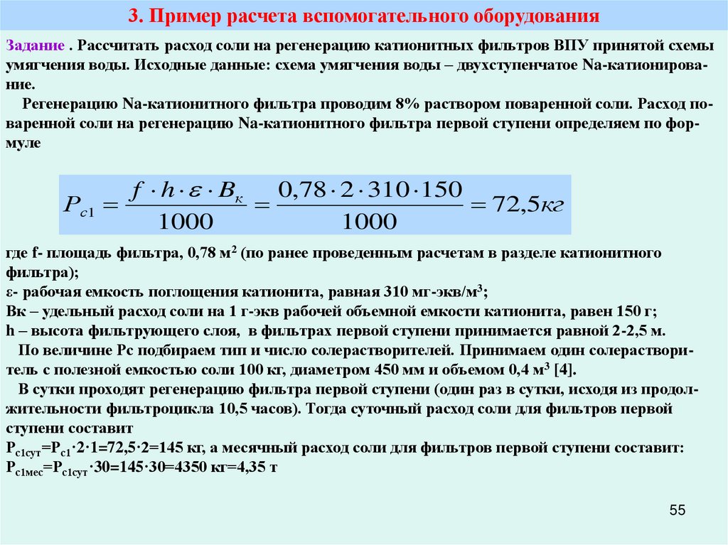 3. Пример расчета вспомогательного оборудованияЗадание . Рассчитать расход соли на регенерацию катионитных фильтров ВПУ принятой схемы