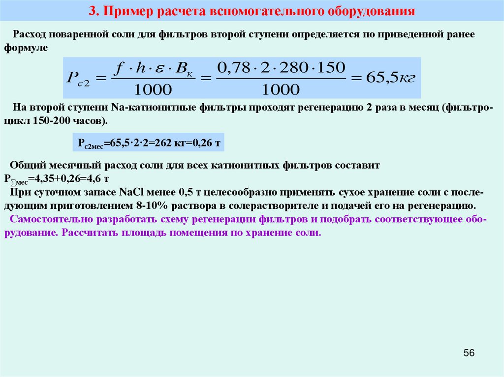 3. Пример расчета вспомогательного оборудованияРасход поваренной соли для фильтров второй ступени определяется по приведенной ранее