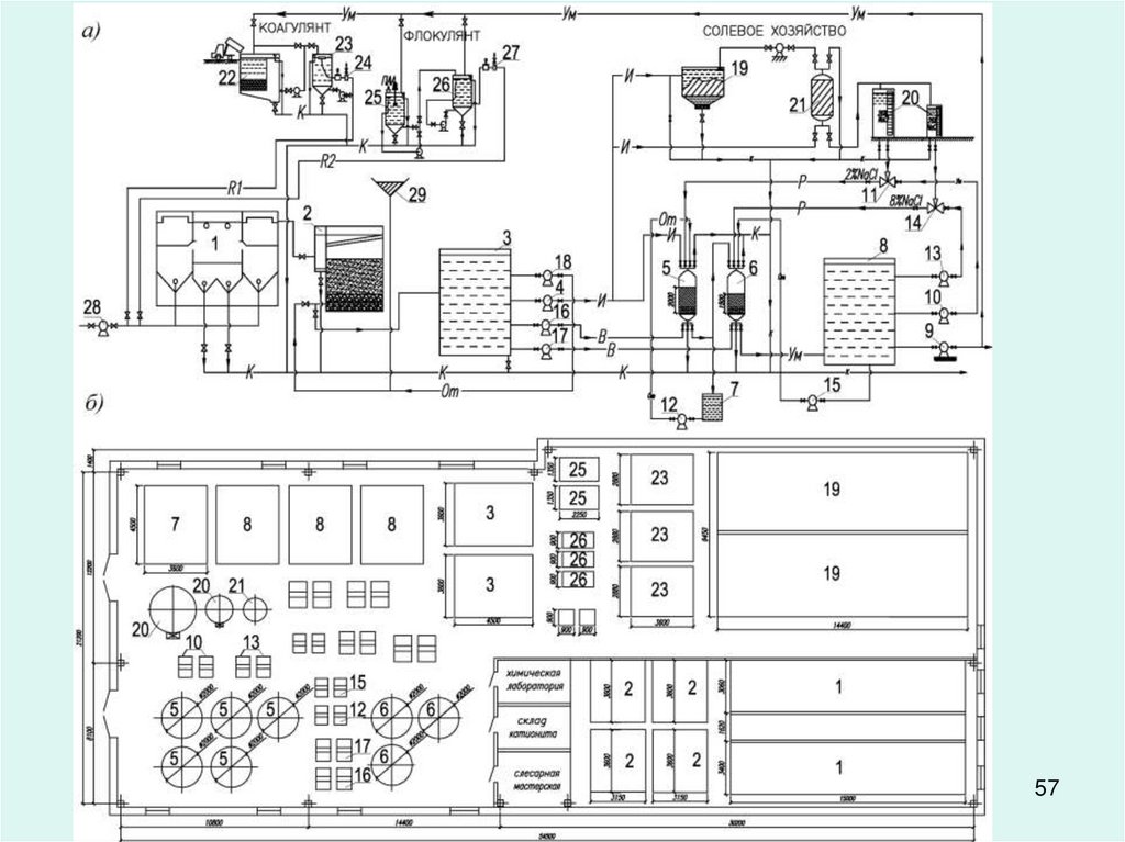 исходной воды; 29 – водонапорная башня промывной воды для скорых фильтров