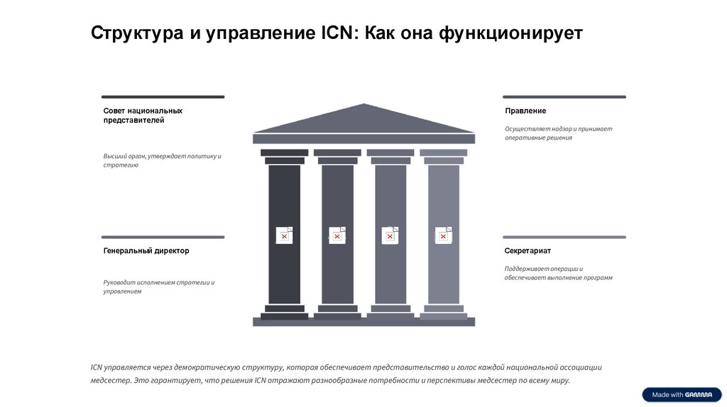 ICN управляется через демократическую структуру, которая обеспечивает представительство и голос каждой национальной ассоциации