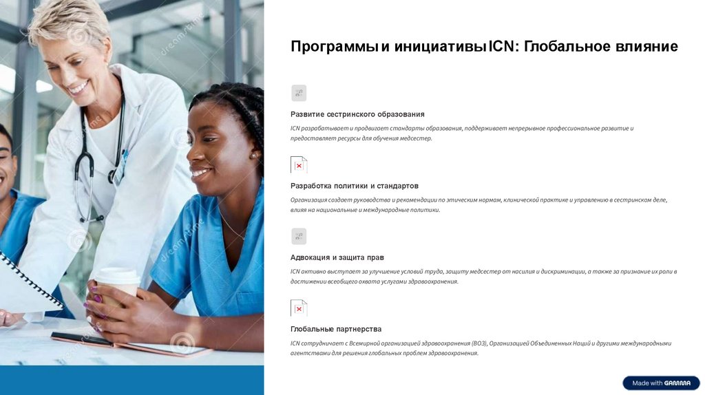 ICN устанавливает высокие стандарты сестринской практики, образования и этики, способствуя профессиональному росту медсестер во всем