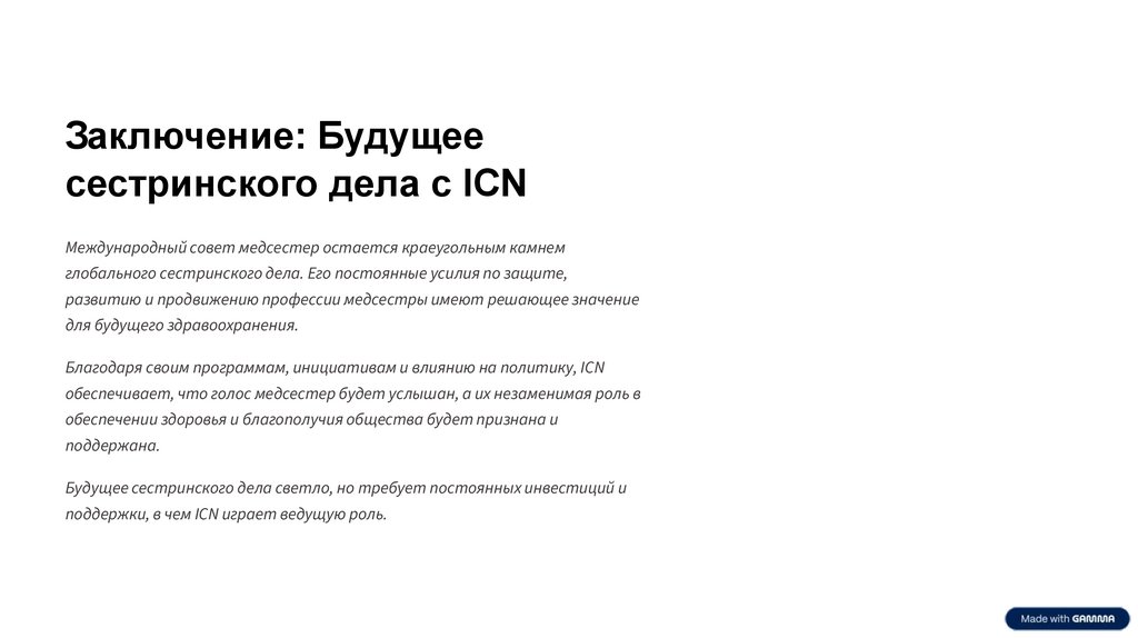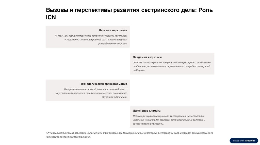 ICN продолжает активно работать над решением этих вызовов, продвигая устойчивые инвестиции в сестринское дело и укрепляя позиции медсестер