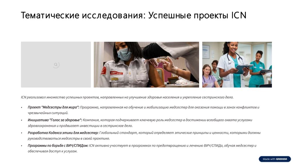 Тематические исследования: Успешные проекты ICNICN реализовал множество успешных проектов, направленных на улучшение здоровья населения и укрепление сестринского дела.