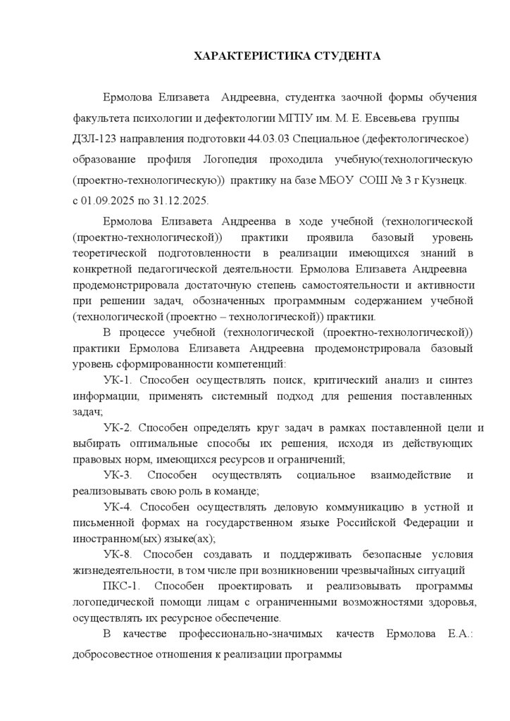 ХАРАКТЕРИСТИКА СТУДЕНТАЕрмолова Елизавета Андреевна, студентка заочной формы обучения
