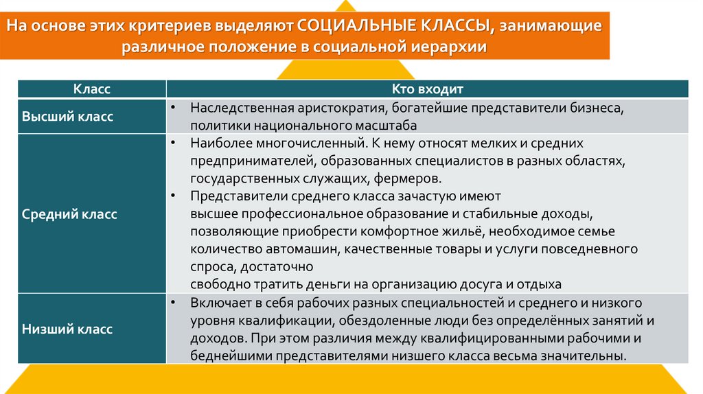 На основе этих критериев выделяют СОЦИАЛЬНЫЕ КЛАССЫ, занимающиеразличное положение в социальной иерархии