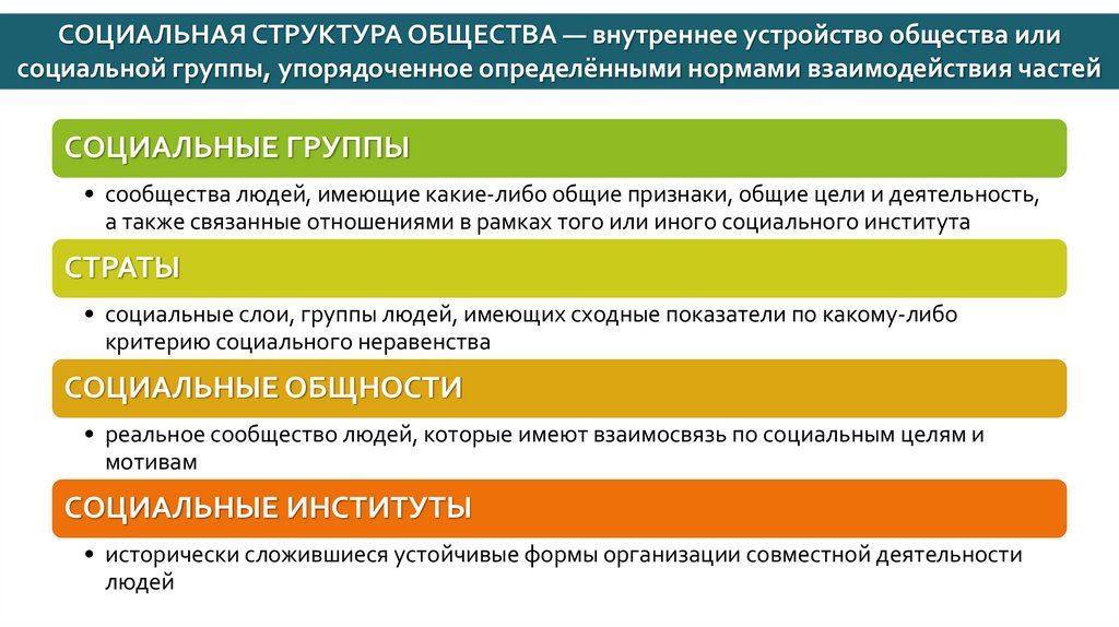 СОЦИАЛЬНАЯ СТРУКТУРА ОБЩЕСТВА — внутреннее устройство общества илисоциальной группы, упорядоченное определёнными нормами взаимодействия частей